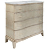 The four-drawer Starlite Media Chest has a figurative stone top and a hidden power source attached to the back. The serpentine chest is finished in silver Bezel paint that has been glazed and gently aged for a soft sheen.