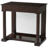 The Lindsay console table quietly charms with strict lines, perfect symmetries and secrets. a plain frieze apron holds a hidden drawer. The table base is a network of turned and fluted column supports and pilasters with a mirrored back panel. Set on a concave plinth base.