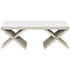 Seating makes a statement with this double bench, blending bold modern geometry with organic textures that soften the look with vintage-inspired style. a striking slatted base in a double-X design supports a finely tailored upholstered seat, creating a piece that stands out anywhere from the living room to the bedroom.