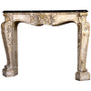 Exquisite shell and foliated ornamentation highlight the graceful curves of the French fireplace surround. Cast in stone with an antique parchment finish and a black fossil stone top make this the look of elegance.