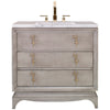 This Mahogany sink chest features an ash grey finish and white Carrera marble top. Two working drawers are complemented by coral shaped brass pulls. The chest is raised on a chinoiserie inspired carved base. Porcelain sink bowl is included. Faucet shown is not available.