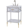 Inspired by French Empire style antiques, this small scale sink chest features a stainless steel frame accented with polished brass rosettes and turned feet. The apron, vanity and shelf are white Carrera marble. Also available in a 34" size: 68001-110-401.