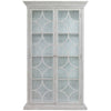 This soft grey cabinet features two doors with diamond shaped mullions over clear glass. Polished nickel oval shaped door pulls. The lit interior includes four wood framed glass shelves.