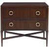 This Walnut concave chest includes a reeded facade supported on tall tapering legs with X stretchers. Brass ring pulls.
