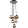 This dramatic Muir Chandelier, exclusively designed by Jonathan Browning for McGuire, combines Jonathan's decades of design with the shadows and shapes created on the valley floor of Muir Woods. Crafted from solid brass and distinct in form, a graphic cage - in a lite antique finish - becomes a study in repetition with ten layers at varying heights. Crystal diffusers in each of the cages mimic the sunlight that falls between the branches of the Northern California redwoods. Each solid brass cage is carefully crafted to achieve the angle, proportion and scale; the result in the chandelier is a work of art. The oil rubbed bronze sockets and 21.875" diameter ceiling plate complete this piece. Complements the Muir Sconce, Mobile Pendant, Single Pendant and Floor Lamp.