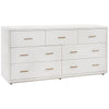 The Livia 7 Drawer chest brings super-chic style thanks to its natural white faux linen texture and antique brass-finished hardware.