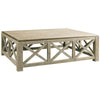 This imposing crate cocktail table is 4' x 5' and wonderfully masculine, ideal for large gathering rooms. The striking driftwood grey finish and antique metal accents make it a one-of-a-kind.