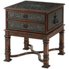 A mahogany and poplar burl bedside chest with etched brass panel decoration, the quare top above two drawers and side carrying handles, on carved and square paneled legs.