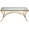 Uttermost's coffee tables combine premium quality materials with unique high-style design. With the advanced product engineering and packaging reinforcement, Uttermost maintains some of the lowest damage rates in the industry. Each product is designed, manufactured and packaged with shipping in mind. Gracefully arched hand forged iron finished in heavily antiqued gold leaf. Top is clear beveled tempered glass.