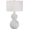 Uttermost's lamps combine premium quality materials with unique high-style design. With the advanced product engineering and packaging reinforcement, Uttermost maintains some of the lowest damage rates in the industry. Each product is designed, manufactured and packaged with shipping in mind. This table lamp is executed in a rich ivory ricestone that accurately replicates the look of thassos marble featuring scalloped ridges and polished nickel accents. The round hardback shade is covered in a white linen fabric.