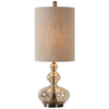Uttermost's lamps combine premium quality materials with unique high-style design. With the advanced product engineering and packaging reinforcement, Uttermost maintains some of the lowest damage rates in the industry. Each product is designed, manufactured and packaged with shipping in mind. Curvaceous, light amber glass accented with antique brass plated steel details. The tall, round hardback shade is a khaki linen fabric with natural slubbing.