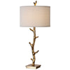 Uttermost's lamps combine premium quality materials with unique high-style design. With the advanced product engineering and packaging reinforcement, Uttermost maintains some of the lowest damage rates in the industry. Each product is designed, manufactured and packaged with shipping in mind. Cast from an authentic tree branch, finished in a plated antiqued gold, sitting on a coordinating steel foot. The round hardback drum shade is an ivory linen fabric.