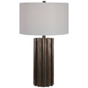 Uttermost's lamps combine premium quality materials with unique high-style design. With the advanced product engineering and packaging reinforcement, Uttermost maintains some of the lowest damage rates in the industry. Each product is designed, manufactured and packaged with shipping in mind. This table lamp features a deep fluted steel base finished in an aged gunmetal with rust distressing and brass plated edges, for a rustic industrial feel. The round hardback drum shade is a white linen fabric.