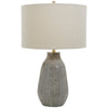 Uttermost's lamps combine premium quality materials with unique high-style design. With the advanced product engineering and packaging reinforcement, Uttermost maintains some of the lowest damage rates in the industry. Each product is designed, manufactured and packaged with shipping in mind. Exhibiting a handcrafted look, this ceramic table lamp features a textured finish reminiscent of woven fabric and is finished in various shades of neutral grays and taupe with rust brown accents and antique brushed brass hardware. The piece is completed by an off-white hardback drum shade with natural slubbing.