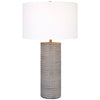 Uttermost's lamps combine premium quality materials with unique high-style design. With the advanced product engineering and packaging reinforcement, Uttermost maintains some of the lowest damage rates in the industry. Each product is designed, manufactured and packaged with shipping in mind. This ceramic table lamp showcases a rustic chiseled texture with frosted pewter gray undertones and organic carved accents in light sepia tones. Iron details are finished in antique brass. The lamp is complimented by a white fabric drum shade.