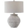 Uttermost's lamps combine premium quality materials with unique high-style design. With the advanced product engineering and packaging reinforcement, Uttermost maintains some of the lowest damage rates in the industry. Each product is designed, manufactured and packaged with shipping in mind. Showcasing an old-world style, this ceramic table lamp has a heavily distressed stone ivory finish and aged gray undertones, accented with brushed nickel plated details. The hardback drum shade is a warm, light gray linen fabric.