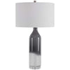 Uttermost's lamps combine premium quality materials with unique high-style design. With the advanced product engineering and packaging reinforcement, Uttermost maintains some of the lowest damage rates in the industry. Each product is designed, manufactured and packaged with shipping in mind. Perfect for any room style, this art glass table lamp features a transitional style with an light gray and frosted white ombre look, displayed on a thick crystal foot accented with brushed nickel details. The lamp is paired with a white fabric drum shade.