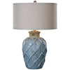 Uttermost's lamps combine premium quality materials with unique high-style design. With the advanced product engineering and packaging reinforcement, Uttermost maintains some of the lowest damage rates in the industry. Each product is designed, manufactured and packaged with shipping in mind. Pale blue ceramic with a hand applied hammock weave pattern with a dusty bronze top accented with brushed nickel plated details. The round hardback drum shade is a light beige linen fabric with natural slubbing and light blue double trim.