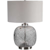 Uttermost's lamps combine premium quality materials with unique high-style design. With the advanced product engineering and packaging reinforcement, Uttermost maintains some of the lowest damage rates in the industry. Each product is designed, manufactured and packaged with shipping in mind. Modern style table lamp features a translucent art glass base with abstract black flecks throughout, accented with brushed nickel details. The round hardback drum shade is a light gray linen fabric with natural slubbing.