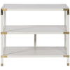 19th century campaign styling is made modern in a simple open tier form. Inspired by period function, a warm wood finish and antique brass mounts soften the modern form of the Faris Tier Table. Mixes as a side table in pairs behind a sofa or as a bedside table.