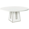 This pedestal dining table features a pyramidal formed base with an outer framework in metal to accent the quartered oak wood.