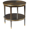 A round top is surrounded by a brass gallery over four tapering legs that are joined by a low round shelf. Crafted from hardwood solids and walnut veneer.