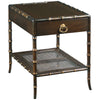 A rectangular top rests over turned faux bamboo flared legs that are joined by a low shelf. Crafted from hardwood solids.