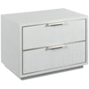An Art Deco inspired cabinet with a rectangular top over two ample drawers fitted with soft closing slides accented with brass moldings raised on an inset plinth base.