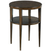 A graceful table with neo-classic roots has a round top resting over four squared tapered posts joined by a middle shelf.