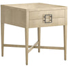 A lovely modern table with a rectangular top that is veneered with rich quarter sawn English sycamore over a pair of handy drawers that are mounted with cast brass hardware. The table is raised on tapering corner posts that are joined by a low X stretcher.