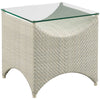 A square tempered glass top rests over four round posts that are enveloped in intricately handwoven synthetic fiber.