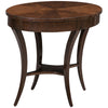 A graceful table styled in the fashion of the late 18th Century French Directoire period. An oval walnut veneered top rests over gracefully tapering saber legs joined by a mid shelf.