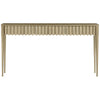 The Reese Console Table is contemporary and textural, defined by ruffles and ribbon detailing. It includes three hidden drawers beneath a surface of irregular white gold leafing.