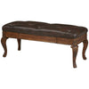 The hidden drawer in Old World Leather Storage Bench's wooden apron slides out easily with the touch of a finger. The Bench's upholstery is in tufted leather, antiqued to match the traditional charm of highly decorative cabriole legs fully carved with acanthus leaf, shell and scroll motifs. The apron rails are decorated with veneered cross banding, and are inlaid with walnut and cherry richly hand-rubbed in a pomegranate to show off the natural beauty of the wood graining.