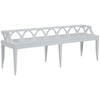 A delightful entryway or dining bench with a colonnade of wooden arches above a wood seat that is elevated on gracefully tapering legs.