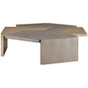 Hexagonal cocktail table with quartered oak veneer in woven pattern layout.