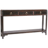 Five foot long console with heavy distressing to emulate a well used antique. Three working drawers and full size lower shelf with shaped corner brackets.Solid brass pulls.