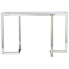 Uttermost's console tables combine premium quality materials with unique high-style design. With the advanced product engineering and packaging reinforcement, Uttermost maintains some of the lowest damage rates in the industry. Each product is designed, manufactured and packaged with shipping in mind. Modern glam console features an asymmetrical dual-toned stainless steel frame finished in polished nickel and polished gold with a clear tempered glass top.