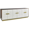 International 60's inspired cabinet with an all walnut case with relief surface patterns on the six gloss white doors and oversized brass hardware that ties back to the plinth base. The long, low clean lines provide great opportunity for living room, dining room, or entertainment function. Behind each pair of doors there is on soft close drawer and one adjustable shelf.