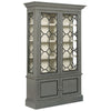 A lovely cabinet for display with a rectangular overhanging molded top over a pair of glass doors in front of adjustable shelves and a lighted interior. The deck is raised on a low base fitted with two doors elevated on a plinth base.