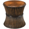 A handy table with a round top veneered with mind that rests over a colonnade of unpeeled rattan poles.