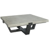 An industrial style transitional square cocktail table providing substantial surface area with a heavy fiber reinforced concrete top held aloft by the solid architectural wood X-base and bronzed angle iron end brackets.
