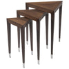 A nest of three Wenge veneer tables, each graduated table with a triangular top and tapering triangular legs with stainless steel feet. Inspired by Art Deco originals.