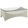 A rectangular tempered glass top rests over four round posts that are enveloped in intricately handwoven synthetic fiber.