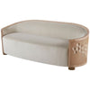 Tight seat and back sofa wrapped in a quartered oak veneer and square mesh cane exterior featuring oak blossom detail and textured brass feet.