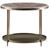 Inspired by the beauty of a cultured pearl, the Oberon End Table is the perfect round occasional table. The resin top swells down as if scooped out of a solid block. This subtle form is suspended in a bronze bezel and with a smoked glass shelf that hovers below on cast bronze feet.