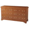 A Biedermeier moment, architectural detailing shines in the six-drawer Viggo dresser fitted with brass handles (in Hampton brass finish) and ivory-finish escutcheons. Beautiful stepped-caddy dresser top and bracket feet. Solid Cherry and veneers.