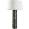 The minimalist form of this sophisticated lamp celebrates form and material. A smooth marble base is accented with thoughtfully placed angled brass rings. It will be sure to add a touch of luxury to any home.