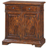 An antiqued wood side cabinet, with two frieze drawers over two parquetry cabinet doors enclosing an adjustable shelf on a moulded base with bracket feet. The original George III.