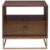 Uttermost's tables combine premium quality materials with unique high-style design. With the advanced product engineering and packaging reinforcement, Uttermost maintains some of the lowest damage rates in the industry. Each product is designed, manufactured and packaged with shipping in mind. Versatile function with modern styling, fully finished in a dark walnut over walnut veneer. Features an open pass-through for decorative storage and a pull-out drawer with an embossed metal pull finished in antique brass, set atop a brushed brass open framed iron base.
